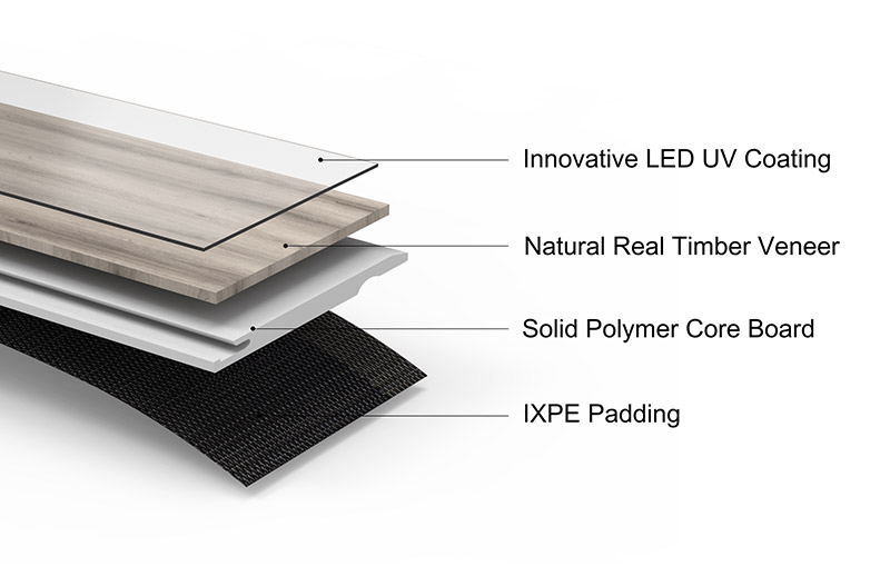 Lagdelt konstruksjon: Finer SPC-gulv består vanligvis av flere lag, inkludert trefinerlaget, et PVC-lag (som inneholder kalkstein og myknere), en SPC-kjerne og et underlag. Denne lagdelte konstruksjonen gir en balanse mellom styrke, stabilitet og estetikk.